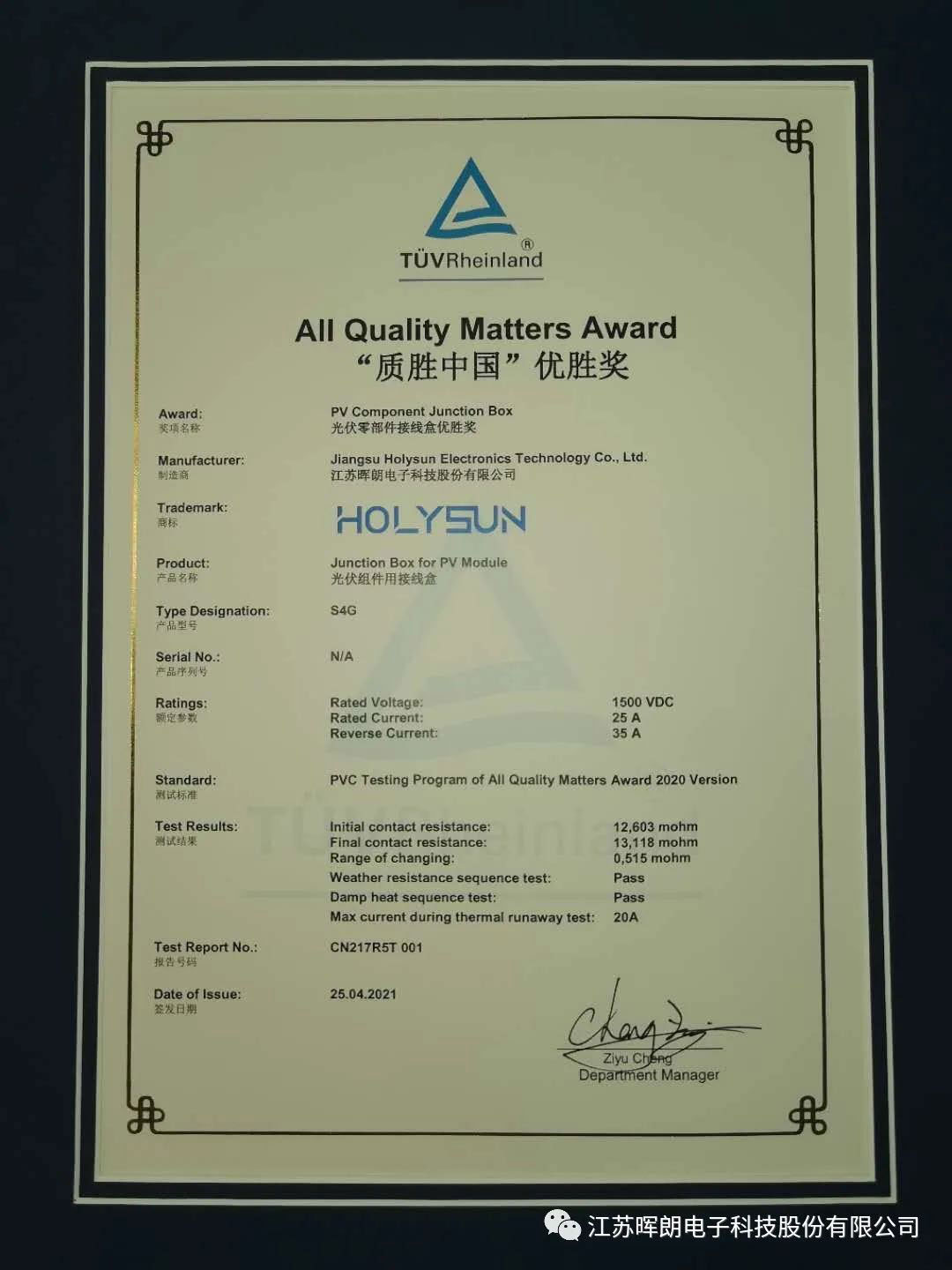 此次XK.COM星空体育(中国)科技公司科技研发团队面向大电流组件的最新市场需求的S4GXK.COM星空体育(中国)科技公司接线盒荣获2020年TÜV莱茵“质胜中国优胜奖”,这是对XK.COM星空体育(中国)科技公司科技产品研发和品质的高度肯定,未来我们将继续立足高品质产品的研发和创新,助力XK.COM星空体育(中国)科技公司行业的降本增效和高质量发展。